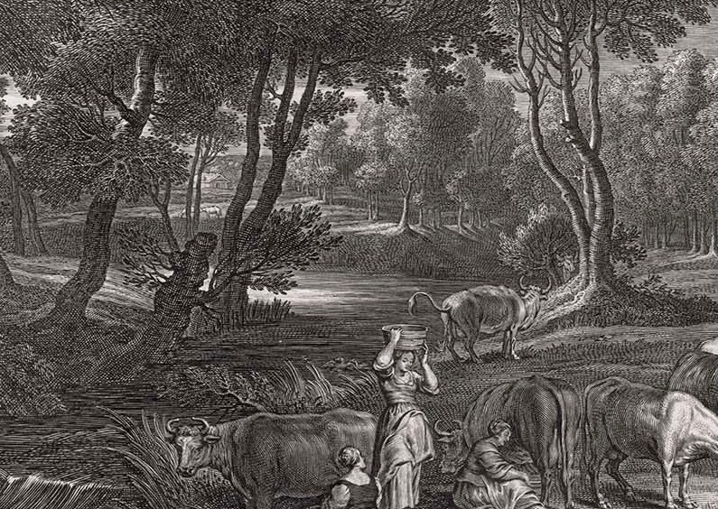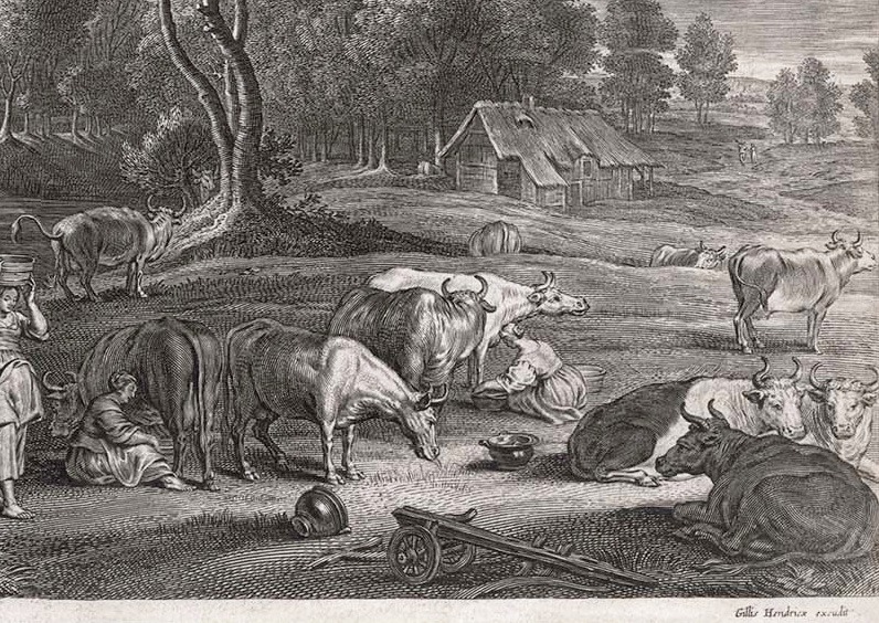 Schelte Adamsz à Bolswert – Landscape with Milkmaids, Cows and Hunters – from ‘Small Landscapes’ 1638