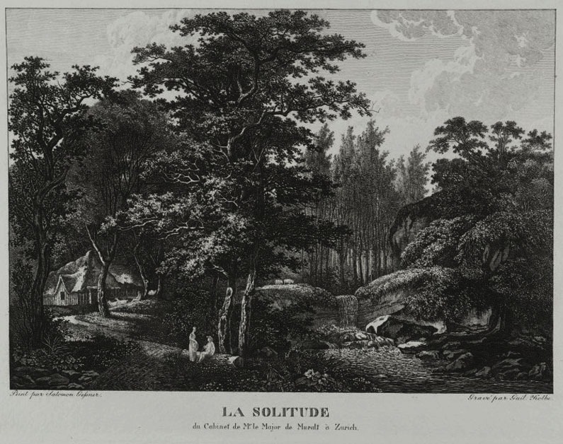 Inscriptions below image: ‘Peint par Salomon Gessner’ – far left; ‘Gravé par Guil Kolbe’ – far right. ‘La Solitude du Cabinet de Mr Le major du Muralt à Zurich’ – centre.