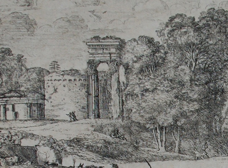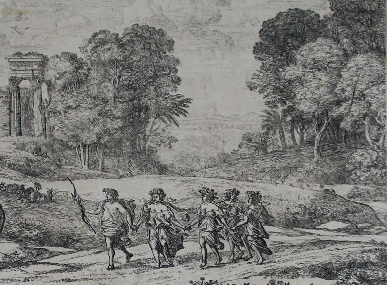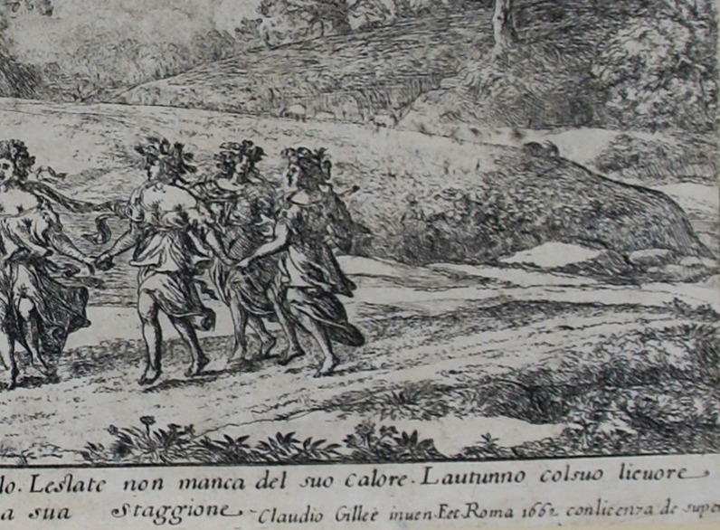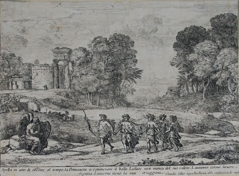 Condition: This was never a strongly inked plate. The faint distant view is characteristic of many of the states. Otherwise good. Vertical line/mark visible in among trees on the right. Very faint mark on cloud above temple. The print has been trimmed around image and encompasses the text lines at bottom: Apollo in atto di obedire al tempo. la Prmavera a cominciare il ballo. Leslate non manca del suo calore. Lautunno colsuo lieuore Seguita. Linuerno tierne la sua Staggione. Claudio Gillee inven. Fec Roma 1662 Conlicenza de super.