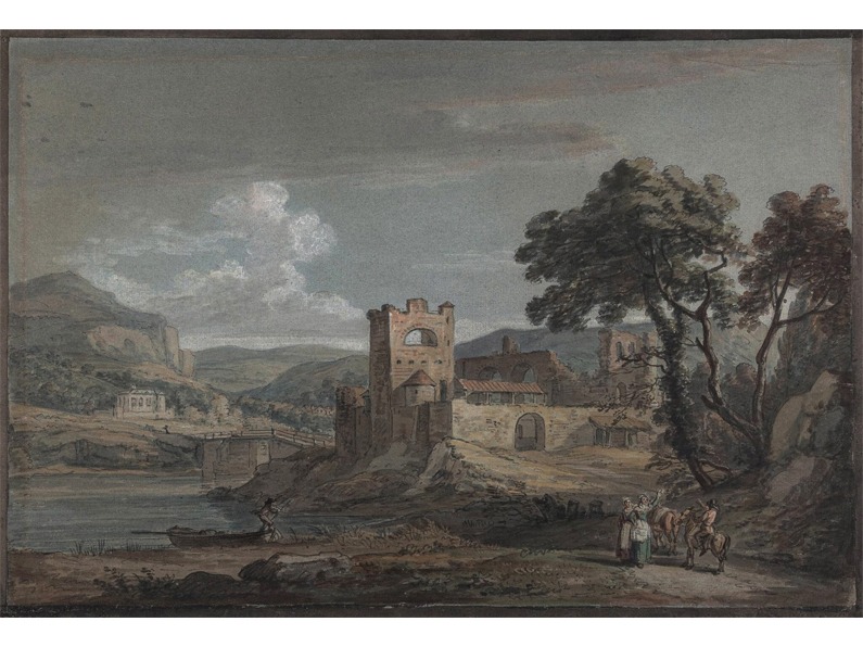 A good example of Sandby’s wholly imagined landscapes is the watercolour Capriccio Landscape. Painted in 1779 it depicts an Italian style landscape with a partly ruined walled villa and ruined aqueduct behind. Beyond that is a river crossed by a wood bridge, set within a mountainous landscape that has the appearance of the Italian Campagna. It is a complete fantasy but it has an authentic feeling even though he had never visited Italy. Sandby had been making prints in an Italian (and Dutch) manner since the late 1740s when he made several etchings based on drawing books, manuals that were educational aids for aspiring artists. These instruction booklets included landscapes in Dutch and Italian styles. Capriccio Landscape features many of the elements found those studies.