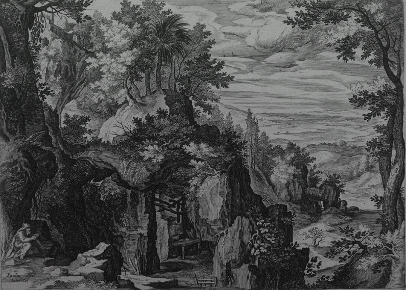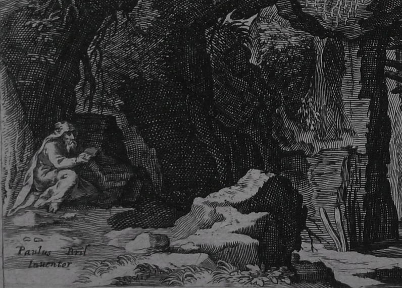 ‘Paulus Bril Inventor’ added to bottom left corner of the plate below the seated hermit, within the image.