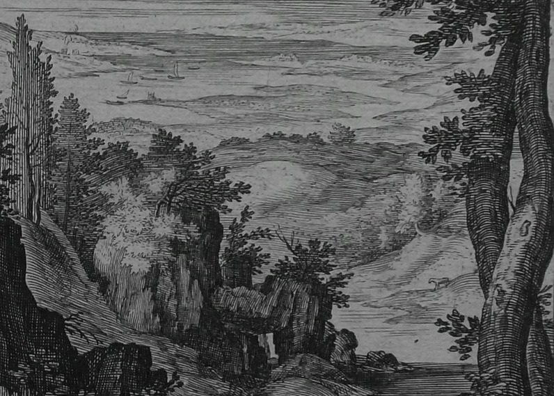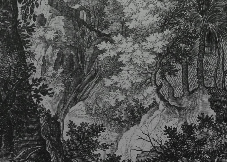 Despite the change in attribution, the print is a fine example of a Sadeler/Bril engraving. Bril’s drawing Mountains with a Hermit (Louvre Inv. No. 19.779) from which this print is based, dates from the early 1590s. Sadeler could have done his engraving when he was in Rome in 1593. The hermit sits under a rocky outcropping reading. Above to the left, barely visible, are ruins, possibly from the area around Tivoli. Where Sadeler’s print is in reverse to Bril’s drawing, this version, being mirror image to Sadeler, is, by chance, correctly orientated to the Bril drawing.